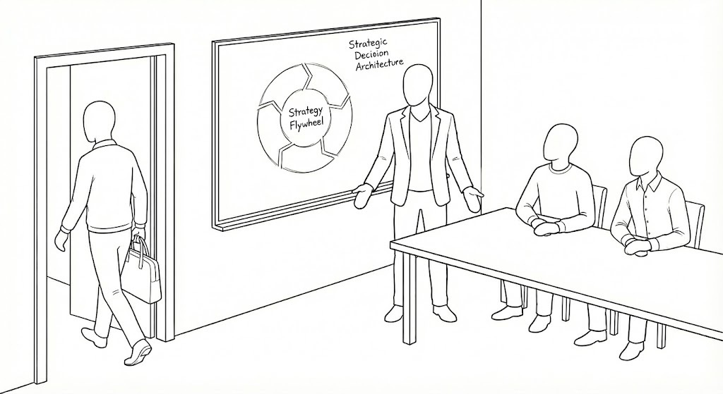 He gestured at the walls—the work they’d done over three days. “You built this. The flywheel. The positioning. Strategic Decision Architecture as your territory. Demo, Sell, Build as your sequence. Kedaris as your proof point.”