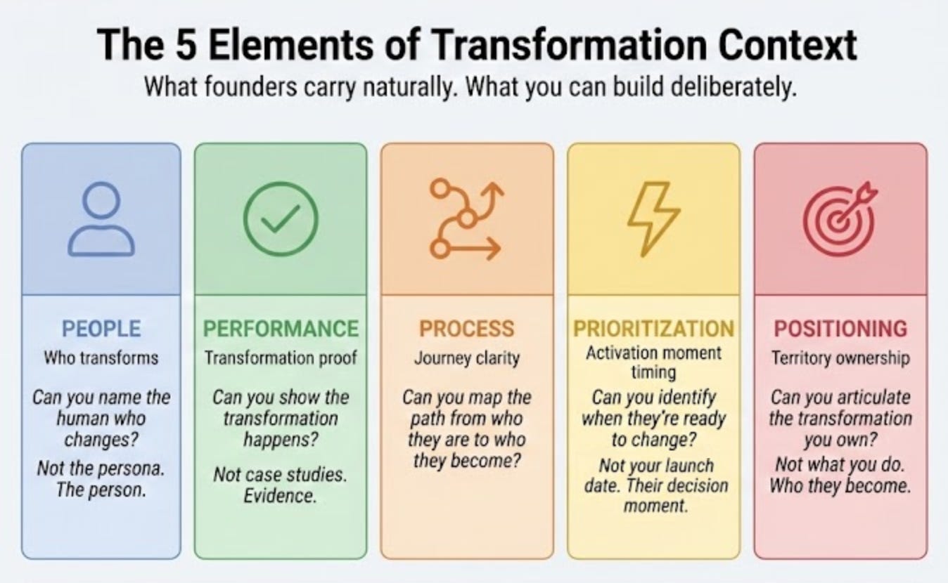 Transformation context has five elements. Build them, and you build the clarity founders carry naturally: