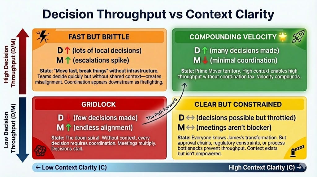 This is why C multiplies D/M in the formula. Context clarity doesn’t just increase decisions made. It decreases meetings required. The numerator goes up. The denominator goes down. Velocity compounds.