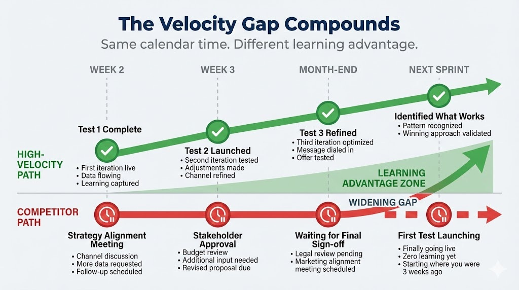 What they can’t copy is the velocity infrastructure that let you discover that strategy in the first place. By the time they implement what worked for you six months ago, you’ve already learned what works now.