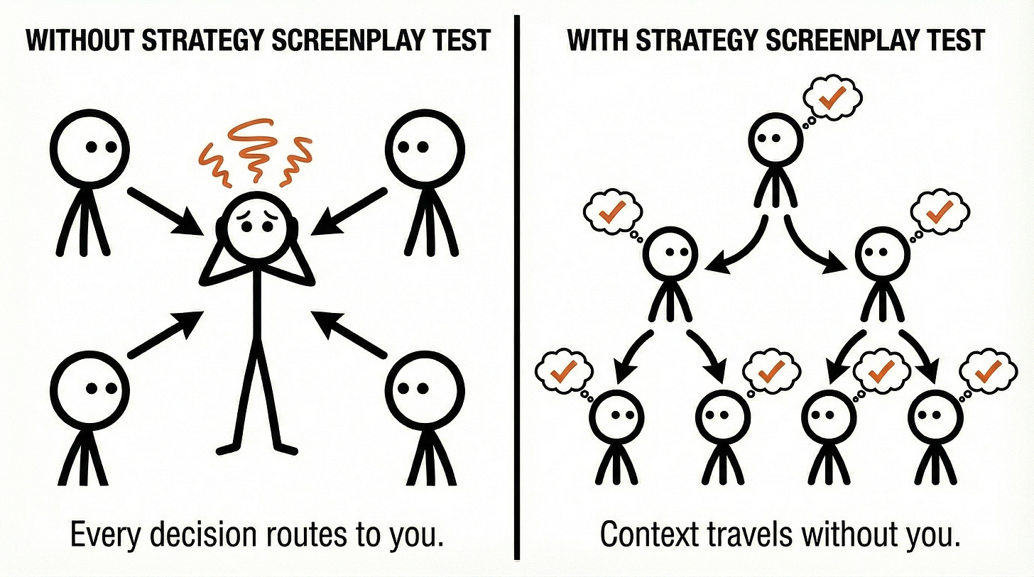The Strategy Screenplay Test makes intuitive sense the moment you hear it. Of course you should verify your strategy can be executed before planning cycles begin. Of course you should discover gaps in framing before they become gaps in execution.